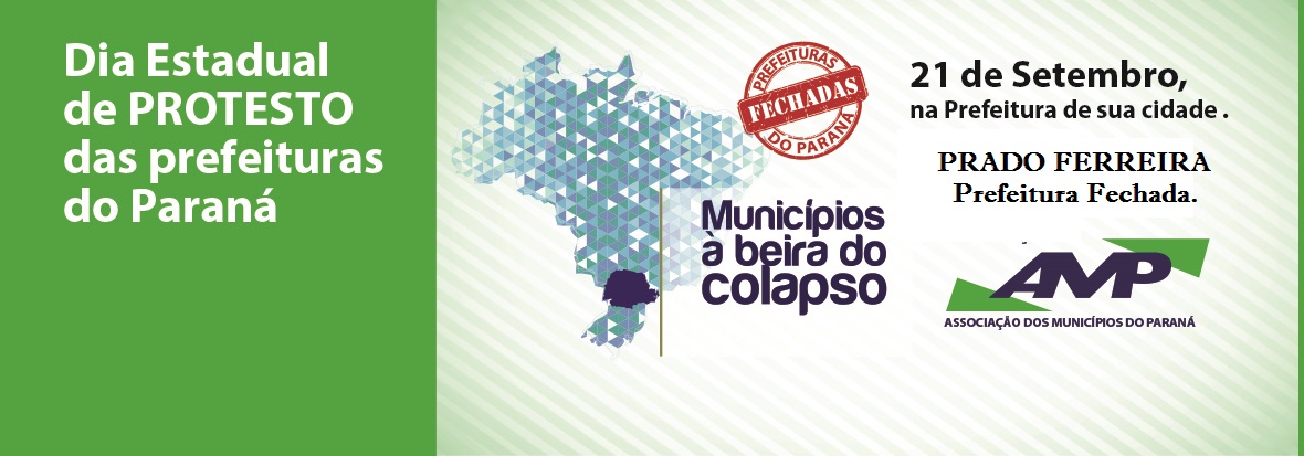 Prefeituras de todas as regiões do Paraná vão protestar contra a crise enfrentada pelos municípios na segunda-feira da próxima semana (dia 21). Liderada pela AMP (Associação dos Municípios do Paraná), com o apoio das 19 associações regionais de municípios do Estado, a manifestação será marcada por atos públicos nos municípios para pedir o apoio da população e das autoridades diante do problema.